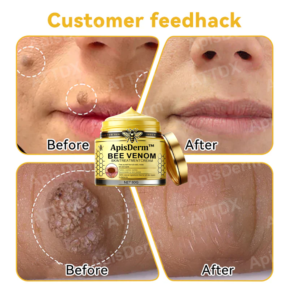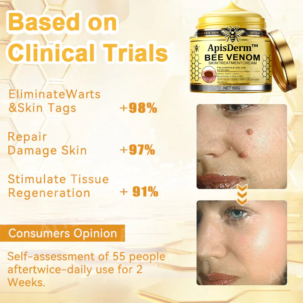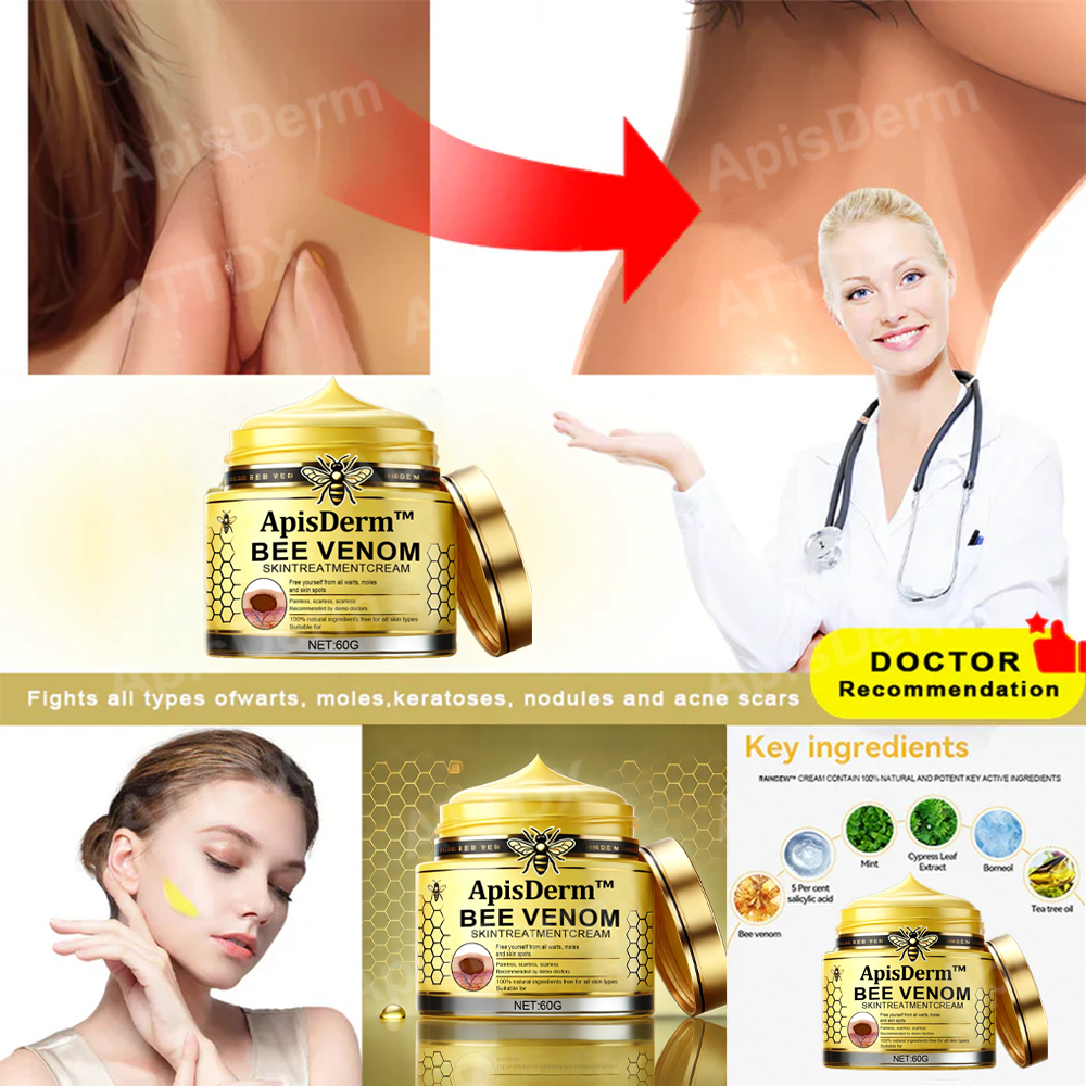 ApisDerm™ Bee Venom Treatment Cream provides a solution by harnessing the potent properties of bee venom to target various skin irregularities such as skin tags, moles, warts, and blemishes. Enriched with active ingredients from bee venom, this advanced formula works to break down and gently remove unwanted growths.
