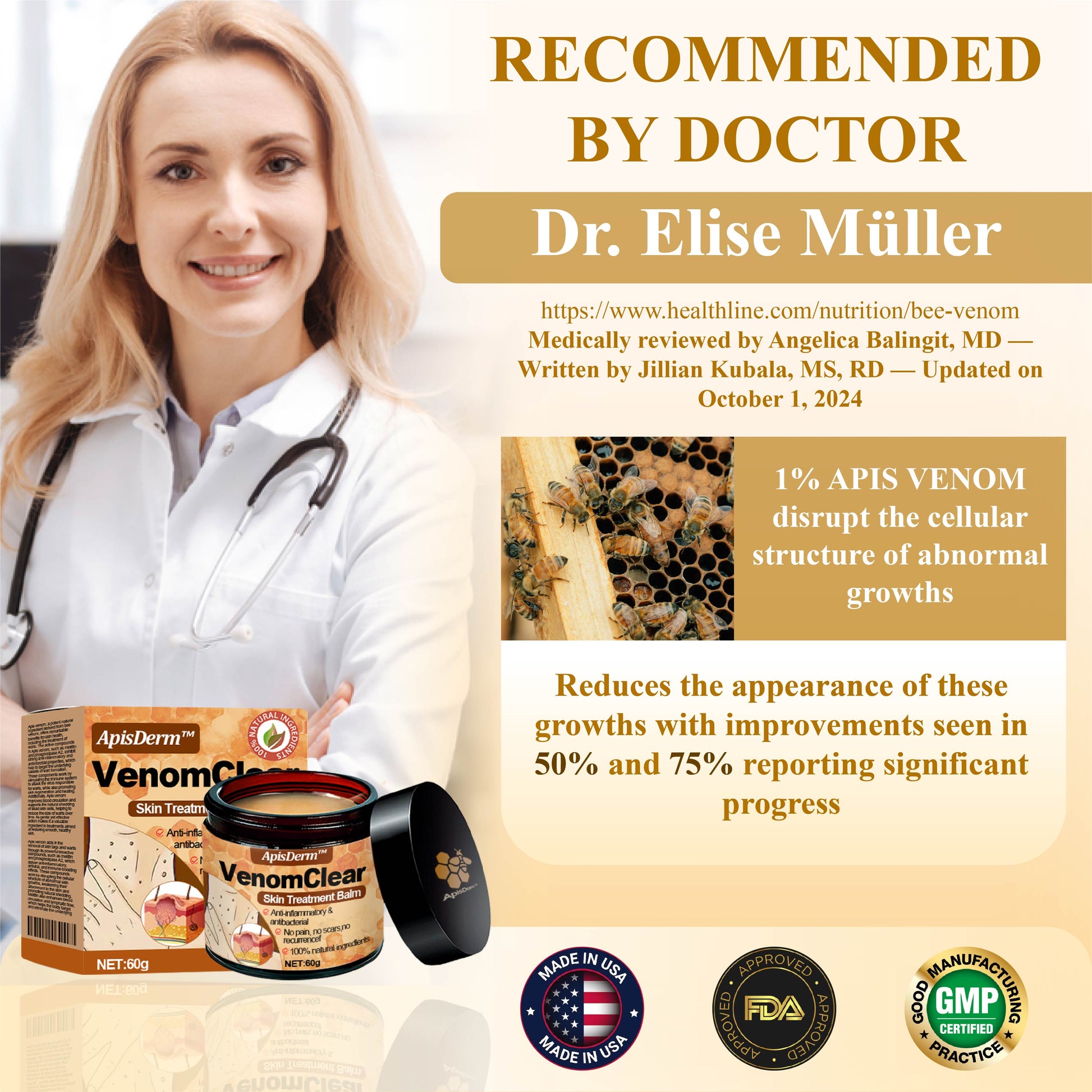 Endorsed by Dr. Elise Müller, Dermatologist at the Skin Health Institute, June 28, 2024, ApisDerm™ VenomClear Skin Treatment Balm is a powerful solution for skin growths like skin tags and warts. Containing 1% Apis Venom, it includes melittin and phospholipase A2 which disrupt the cellular structure of abnormal growths and weakening their attachment and promoting natural shedding.